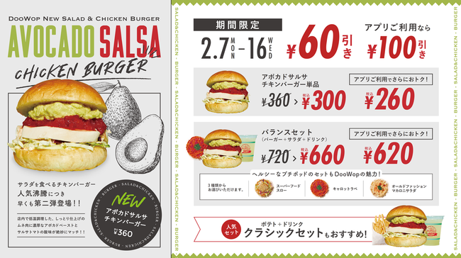 ヘルシー志向の方の声にお応えして、毎日でも食べたくなるサラダを食べる“揚げない”チキンバーガー「ルッコラサラダチキンバーガー」を1/11に販売開始しました。おかげさまでInstagram、YouTubeなどで取り上げられるなど多くの反響を頂いております。今回はサラダを食べる”揚げない”チキンバーガーの第2弾として、「アボカドサルサ チキンバーガー」が新登場。