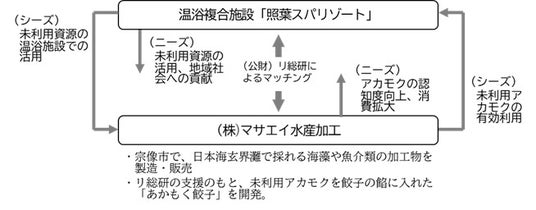 福岡県の外郭団体である「公益財団法人福岡県リサイクル総合研究事業化センター」(以下:リ総研)の共同研究支援の元、アカモクの未利用部分の提供や、スーパーフードとしてアカモクの様々な商品を販売する宗像市にある「株式会社マサエイ水産加工」は、研究開発した商品などの認知拡大や消費促進に課題を感じていました。SDGsに積極的に取り組んでいる照葉スパリゾートがリ総研から上記取り組みを紹介され、コラボが実現しました。