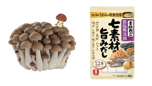 <左>原料となるブナシメジ(イメージ) <右>開発したエキスを使用した商品の例