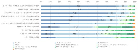 - 食品・日用品はスーパーとドラッグストア、健康食品や化粧品類はECサイトでの購入が多い