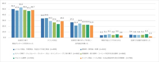 「商品(ジャンル別)を購入したきっかけ」について聞いたところ、スーパーやドラッグストアでは「店頭売り場で商品パッケージが目をひいた」という回答が最も多くなりました。次いで「チラシを見た」「店頭売り場のポップを見た・店内放送を聞いた」が選択されており、店内回遊時の情報が重視されていると言えます。