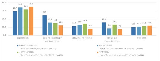 - 健康食品や化粧品類は「店舗で見かけた」後に、ECサイトで購入することも