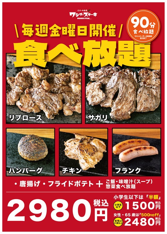 ■驚愕の安さ!ステーキ食べ放題が2980円(税込)で実施。女性・シニアは500円引き。小学生以下は半額!
