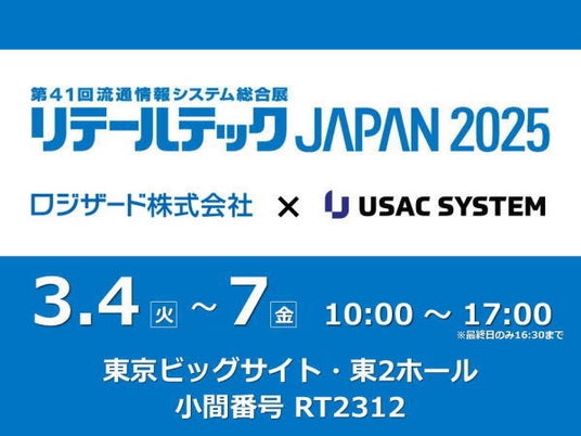 業務プロセスの自動化・効率化を支援するユーザックシステム株式会社(本社:大阪市、代表取締役社長:小ノ島 尚博、以下当社)は、クラウド在庫管理システムのリーディングカンパニーであるロジザード株式会社(本社:東京都中央区、代表取締役社長:金澤 茂則、以下ロジザード)とともに、2025年3月4日(火)から東京ビッグサイトにて開催される第41回流通情報システム総合展「リテールテックJAPAN 2025」に、流通・小売業界における店舗業務のデジタル化を支援するソリューションを出展いたします。