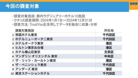 上記10施設の2024年1月~12月に集まったクチコミ19,218件をTrustYou独自で分析した調査レポートになります。