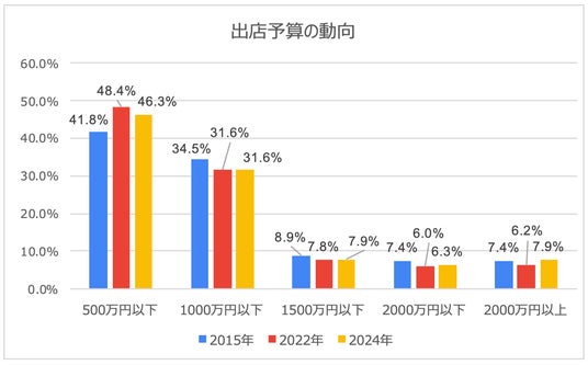 出店予算調査の結果を見ると、前期調査時(2022年)と比較すると、出店予算「500万以下」は2.1%減(46.3%)となり、「1500万円以下」「2000万円以下」「2000万円以上」と微増する形になりました。