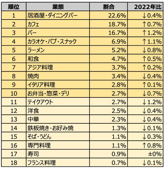 変化の要因として、コロナ禍が明けて「カラオケ・パブ・スナック」のニーズが高まってきたこと、そして、コロナ渦に増えた「テイクアウト」のニーズが落ち着いた可能性が考えられます。