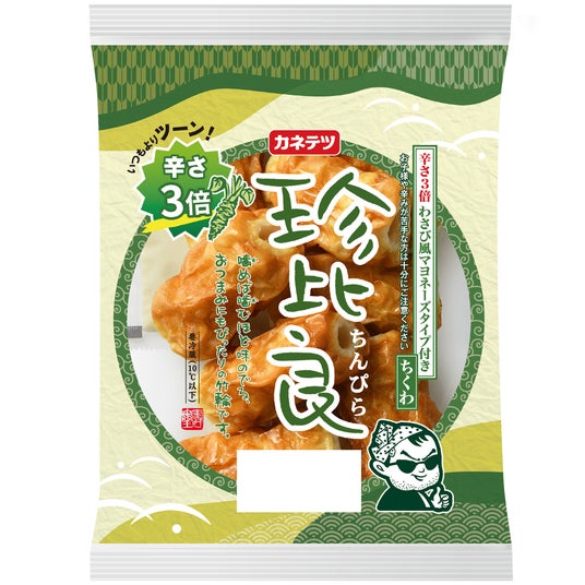 5.珍比良 わさび風マヨネーズタイプ付 辛さ3倍 発売74年目を迎えた「珍比良」に、通常の3倍の辛さ(※)の「わさび風マヨネーズタイプ」を添付した、辛いもの好きにはたまらない一品。のどぐろエキスを使用した、噛めば噛むほど魚の旨みと風味が広がるひとくちサイズの竹輪に、より辛いアクセントが加わったおつまみにもぴったりな一品。