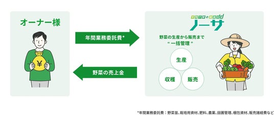 年間業務委託費をお支払いいただくことで、農業のプロであるクールコネクト社が、オーナー様に代わって品質の高い野菜の生産から販売まで一貫して実施。収穫した野菜の売上高がオーナー様に支払われる仕組みです。新規の野菜オーナー様も引き続き募集中です。