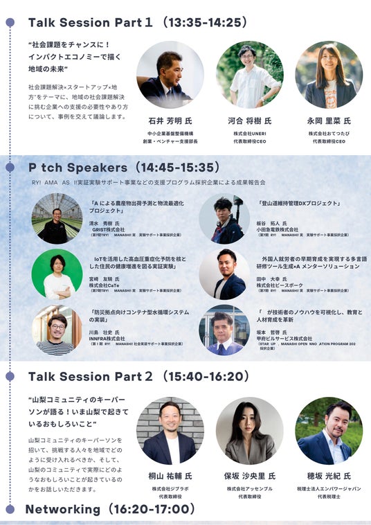 このイベントでは、インパクトエコノミーをリードする豪華ゲストや山梨コミュニティのキーパーソンを招き、「地方×インパクト」や挑戦する人々を受け入れる地域コミュニティの可能性について考えていきます。また、「第7期 TRY!YAMANASHI! 実証実験サポート事業」採択企業など、山梨県で挑戦するスタートアップ等の成果報告も行います。