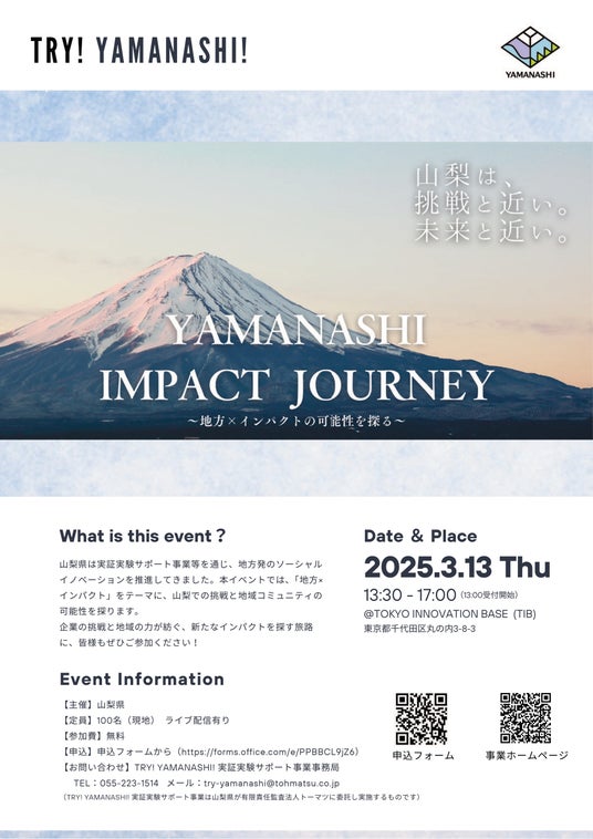 山梨県(知事:長崎幸太郎)は、世界中のイノベーションの結節点を目指す東京都の新たなスタートアップ拠点「Tokyo Innovation Base(TIB)」において、山梨を事例に地方×インパクトの在り方を考えるイベント「YAMANASHI IMPACT JOURNEY ~地方×インパクトの可能性を探る~」を開催します。