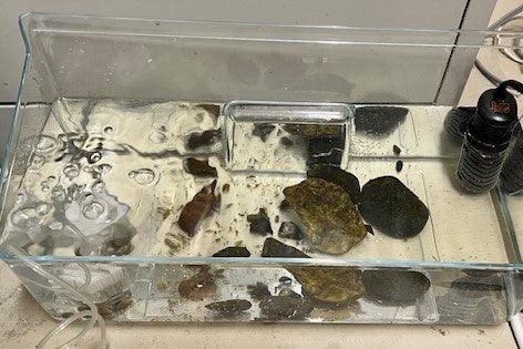 ・水温16~17℃がよいとされ、水槽内の温度を保ちつつ飼育に取り組む(2月中) また水槽内も高麗川の石や水を使い、放流後に近い環境で飼育。エサは沈下性のある金魚の餌(タンパク質が大切)。水換えは週に2回程度、水を1/3ずつぐらいを目途に。実際に川の環境を調査しカワニナを始め生態系の調査へ。