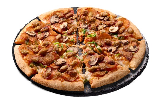 トッピング:ペパロニ、イタリアンソーセージ、マッシュルーム、ピーマン、オニオン(すべて2倍)、トマトソース 、モッツアレラチーズ(通常量)