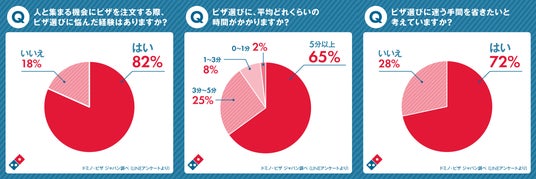 ドミノ・ピザ独自のアンケート調査*結果を見てみると、ピザ選び悩んだ経験がある方は、82%。そして65%の方がピザ選びに5分以上かけているということが判明しました。さらに、72%の方が「ピザ選びに迷う手間を省きたい」と考えていることもわかりました。