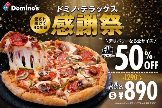 「ドミノ・デラックス」は、愛され続けて40年目。この度、ドミノ・ピザは「ドミノ・デラックス」の決定版となる「ドミノ・デラデラックス」の発売を前に、定番の魅力を再発見していただきたく、2月25日(火)~3月2日(日)の6日間限定で「ドミノ・デラックス感謝祭」を開催します。