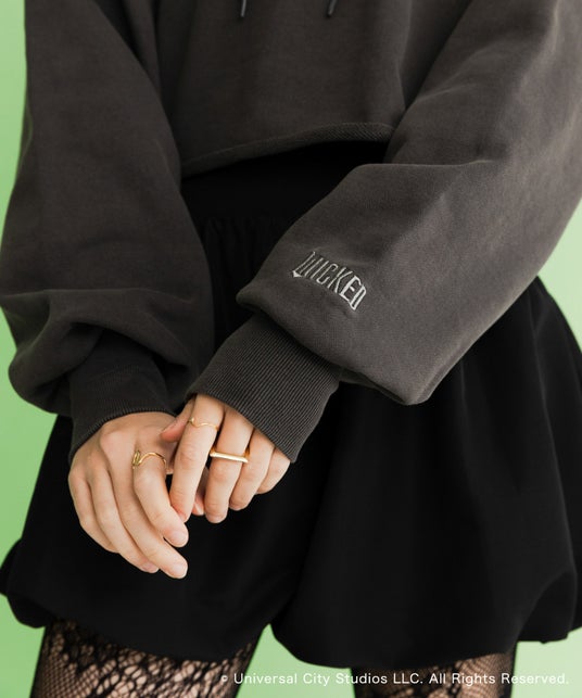 すっきりとした着丈で形はカジュアルながらもスタイルアップが狙えるアイテムです。袖にはWICKEDの文字のラメ刺繍がデザインされ、華やかな雰囲気を演出。