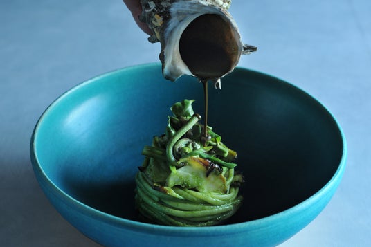サザエにはカリウムやマグネシウムなどのビタミンのほか、ミネラルが多く含まれます。春の訪れを感じる一品目のパスタは、肉厚で甘みのあるサザエをジェノヴェーゼに仕立てました。仕上げにかけるサザエの肝のソースは、豊かな磯の味わいと香りが楽しめます。