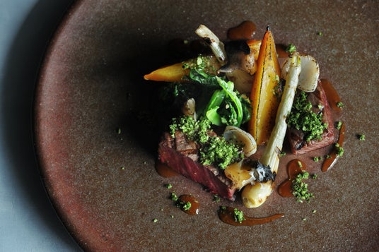 肉料理のメインディッシュ「牛肉とシャコ貝、アーサのパン粉焼き」