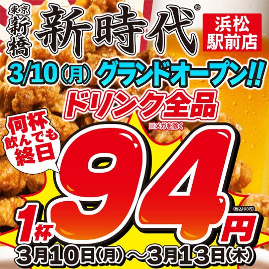浜松初上陸を祝しまして、3月10日(月)~3月13日(木)はメガ以外のドリンク全品、何杯飲んでも終日1杯94円(税込103円)のオープン記念イベントを開催いたします!