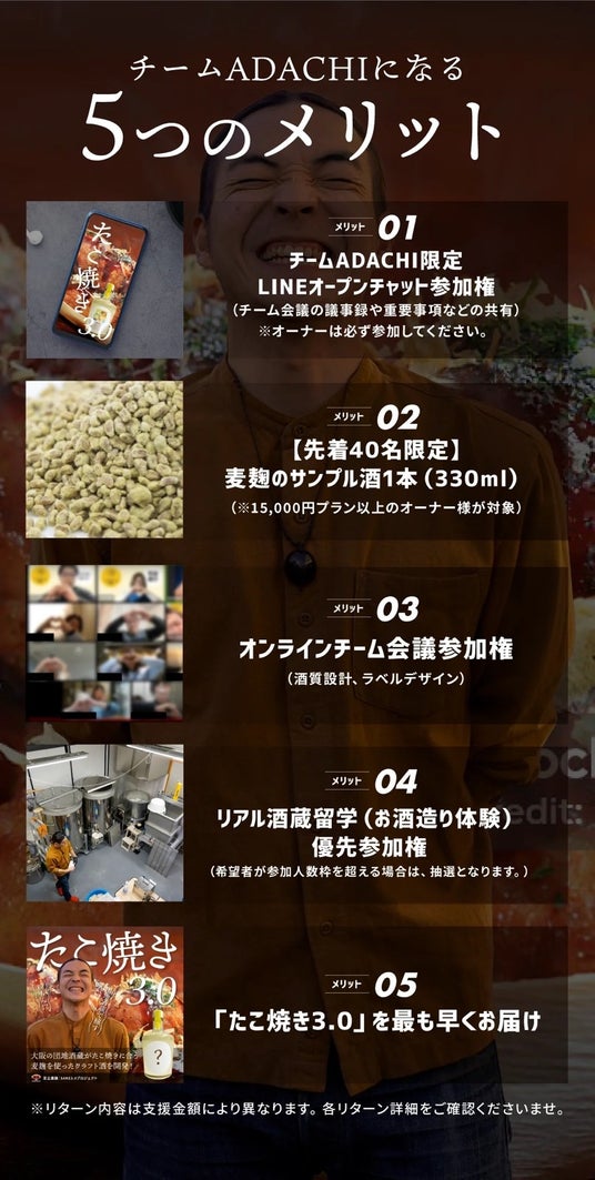 - 20,000円コース:たこ焼き3.0 3本(500ml)、<先着40名限定>麦麹のサンプル酒1本(330ml)、足立農醸オリジナルステッカー、オリジナルポストカード、タンクオーナー権