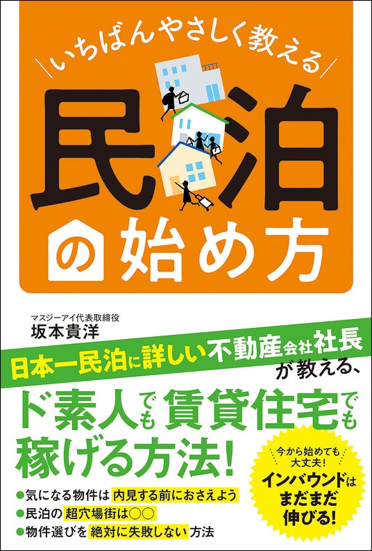 著者は、民泊管理部屋数延べ1,300部屋を超える「日本一民泊に詳しい不動産会社」株式会社マスジーアイ代表の坂本さん。本書では、 「民泊を運営する側」 「物件を提供する側」 の両方に詳しい著者だからこそお伝えできる、「民泊初心者でも手堅く稼ぐ方法」をわかりやすく、余すところなく紹介しています。