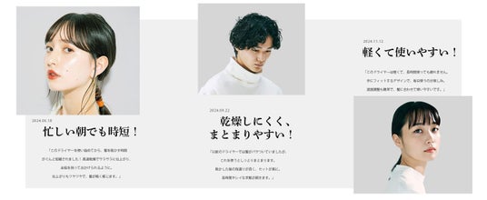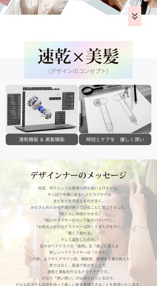 - 見た目からは想像できないパワフルさと、プロフェッショナルの技を再現する独自のテクノロジーとメソッドで、ドライヤーの常識を鮮やかに覆します。