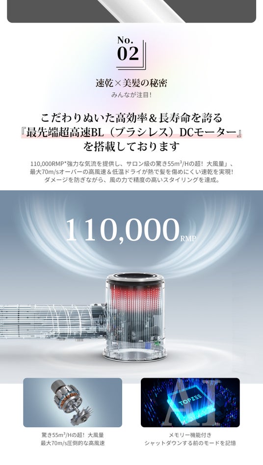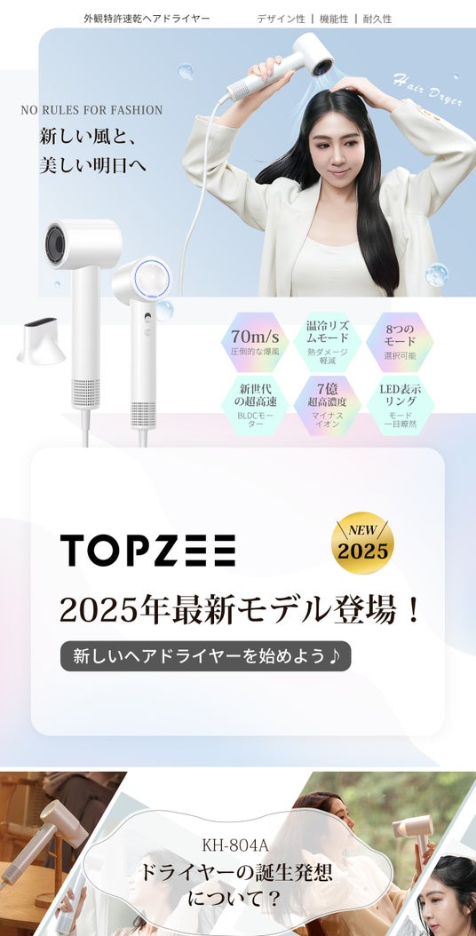 『最先端テクノロジーで誕生、未来のヘアドライヤー!大好評「速乾&美髪」シリーズ待望の第1弾!』 Topzeeのこだわりが詰まった、美容と科学をつなぐ技術。次世代の夢のような「デザイン性」「高品質」「機能性」「新規性」「耐久性」を持つ大風量 ドライヤー。