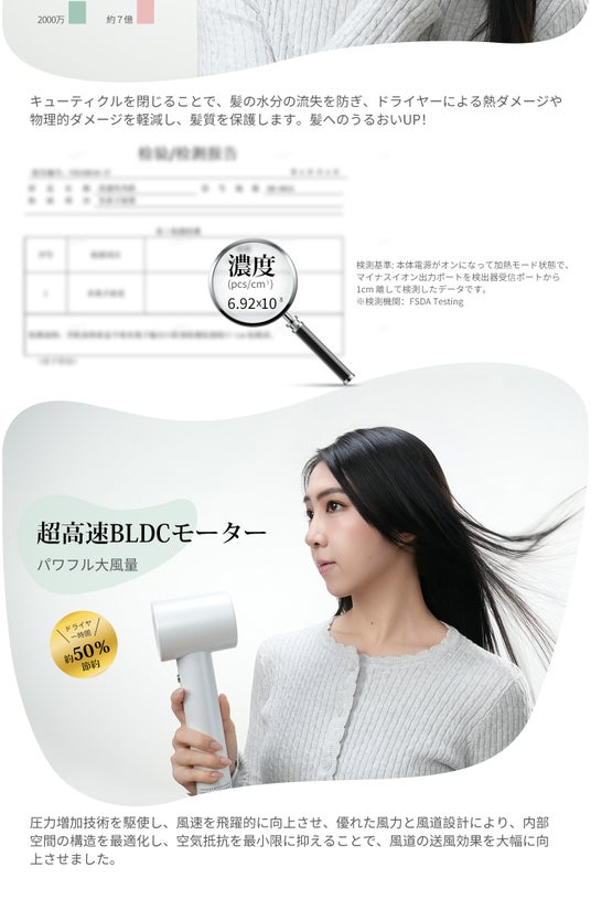 最新高濃度マイナスイオン技術を搭載しています。7億個のマイナスイオンを放出して髪のまとまりを良くし、しなやかさを実現。