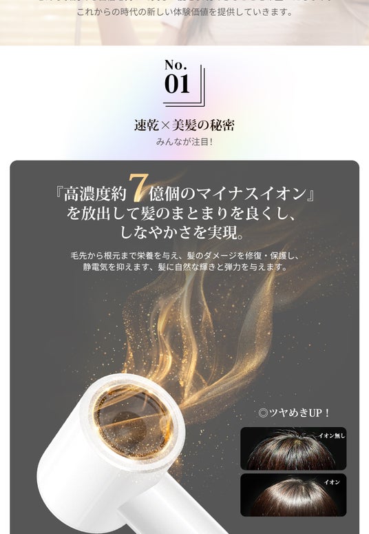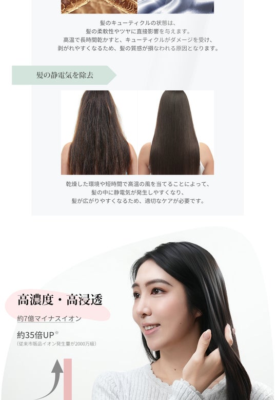 - 高浸透ナノイー(2億マイナスイオン)を毛先まで届ける。