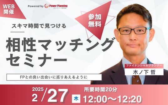 無料マネーセミナー提供サービス「アットセミナー」を運営しているパワープランニング株式会社が「2月27日 (木)12時」に「相性マッチングセミナー」というスキマ時間で自分に合ったFPを見つけられるオンラインセミナーを開催いたします。
