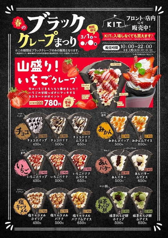 もちもちとした食感の黒いクレープ生地に、全国各地の旬のいちごを贅沢にトッピング。いちごの甘酸っぱさと、カスタードクリームとミルクホイップの2種類の優しい甘さが絶妙にマッチした、春を感じる一品です。