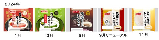 今年発売17周年を迎えるロングセラー商品『大福みたいなホイップあんぱん』は、季節ごとに異なるフレーバーを展開している人気のシリーズです。2024年9月に『大福みたいなホイップあんぱん』は国産米粉を一部使用した生地にリニューアルし、より大福のようなもちもち食感を楽しめる仕立てとなりました。季節ごとに楽しめる『大福みたいなホイップあんぱん』の今後にご期待ください。