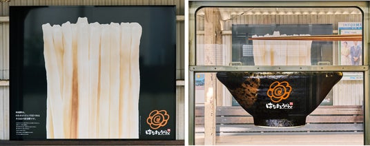 本取り組みを記念して、林道駅の壁面に巨大うどんパネルを掲示します。駅名の由来を伝えることばと、力強く伸びる讃岐うどんの写真が特徴です。コラボ車両内のとある車窓には、はなまるどんぶりのステッカーを掲示しており、「ことでん林道駅 はなまるうどん駅」を通過する際にホームに設置された巨大うどんパネルと重なることで、「うどん箸上げ」ができる仕掛けとなっております。運が良ければ、巨大うどんと箸がぴったり重なるクリエイティブを見ることができます。