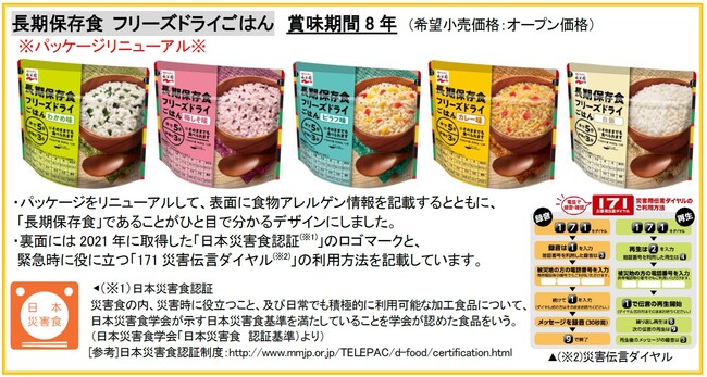 2017 年より発売しています。長年にわたりノウハウを蓄積したFD 技術を活かし、いつでも「手軽に」「おいしく」お召し上がりいただけるほか、一目で永谷園の商品とわかる“定式幕”をパッケージに採用しています。また、熱風で急速乾燥した「アルファ化米」と比べると軽量で、賞味期間は製造後8 年となっているので、備蓄食として入れ替える等の手間の軽減にもお役立ていただける商品となっています。