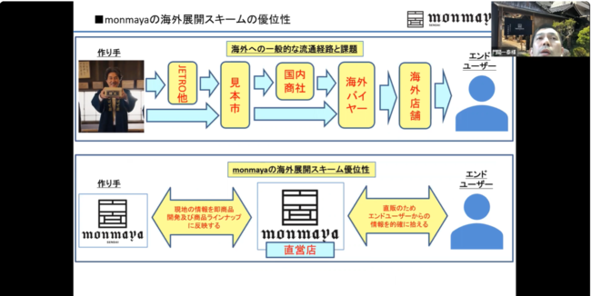 弊社の海外展開のスキームです。作り手からエンドユーザーまで通常の一般的な経路ですと、見本市・商社・バイヤーと、たくさん通すのですが、当社は直営でやるというのもあって、エンドユーザーの生の声を的確に拾えて、それを作り手にフィードバックできる仕組みがあります。