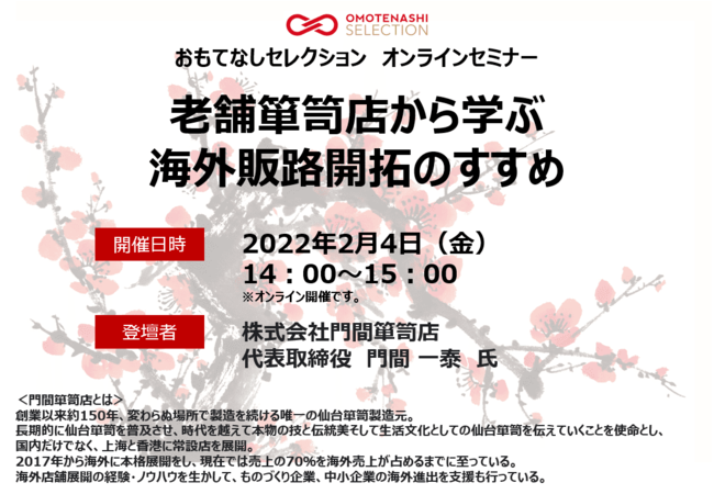 おもてなしセレクションでは、去る2022年2月4日(金)におもてなしセレクションパートナー企業である株式会社門間箪笥店様をお迎えし、「老舗箪笥店から学ぶ海外販路開拓のすすめ」と題したオンラインセミナーを開催しました。中国、香港のマーケットの概況と海外販路に挑戦する意義、"海外初進出から売上シェア7割を占めるまでの成長に至った軌跡"について、実例を交えながらお話をいただきました。その一部をセミナーレポートとして公開します。