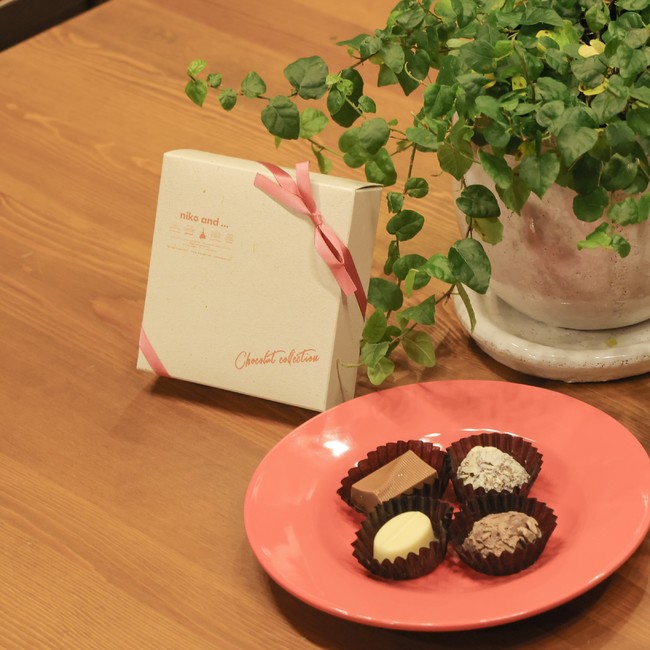 【内容】 ミルクチョコ、ビターチョコ、コーヒーチョコクランチ、ニコアンドのロゴをプリントしたホワイトチョコ、生チョコケーキ4種類のチョコレートと焼菓子の詰め合わせです。