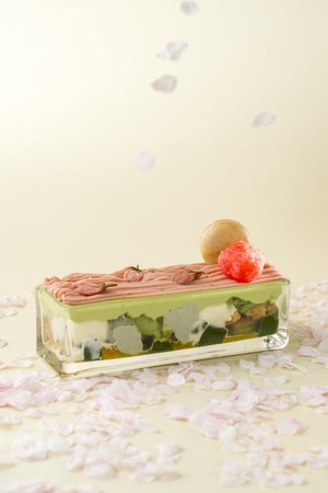 今回は、桜の香りと共に爽やかな春の訪れを感じて頂けるよう、柔らかな桜の風味を引き立てるアクセントとして抹茶生地には日本酒シロップを染み込ませてほんのりふくよかな香りを与え、さっぱりと頂けるよう、爽やかないちご果肉とミントジュレ、抹茶アイスを添えています。