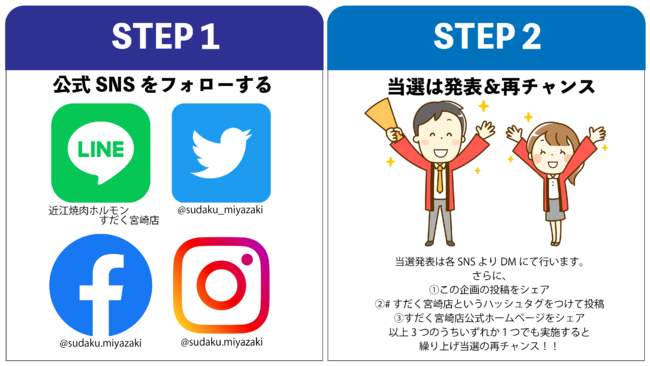 Facebook(近江焼肉ホルモンすだく宮崎店)、Twitter(@Sudaku_miyazaki)、Instagram(@sudaku.miyazaki)、LINE(@697nqbuw)をフォローしていただき、抽選で当選者を決定いたします。