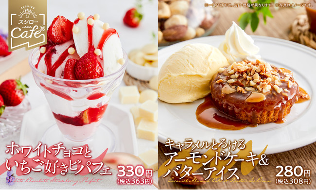 株式会社あきんどスシロー(本社:大阪府吹田市、代表取締役社長:堀江 陽)は、2月21日(月)より、春の訪れを感じさせる、旬のフレッシュいちごを使ったパフェ「ホワイトチョコといちご好きピパフェ」330円(税込363円)を全国のスシローにて期間限定で販売いたします。さらに、一流ホテルで経験を積んだ、キャラメル好きのパティシエ考案のスイーツ「キャラメルとろけるアーモンドケーキ&バターアイス」も同日より販売いたします。