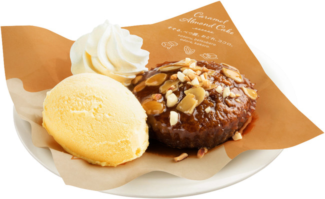 また、キャラメル好きのパティシエが考案したスイーツ「キャラメルとろけるアーモンドケーキ&バターアイス」では、ふんわり温かくキャラメルがとけて染み込むパウンドケーキに、バターそのものの美味しさが味わえる北海道バターアイスを添えました。アーモンドの食感とキャラメルの深い味わい、アイスの濃厚さを合わせてお楽しみください。ほんのり温かいパウンドケーキと冷たいバターアイスの組み合わせは思わず虜になる“ひやあつ”スイーツです。
