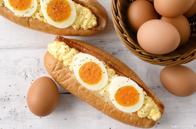 トーストしたドッグパンの中にマイルドな味わいのたまごサラダをたっぷり詰め、半熟風たまごをのせました。スモークの風味が利いたベーコンと粗挽きブラックペッパーがアクセントになっています。