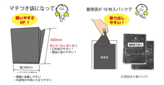 袋サイズを長くし、口を結ぶことが楽になるなど改良。使用原料に「バイオマスプラ」を10%使用し環境にも配慮しています。