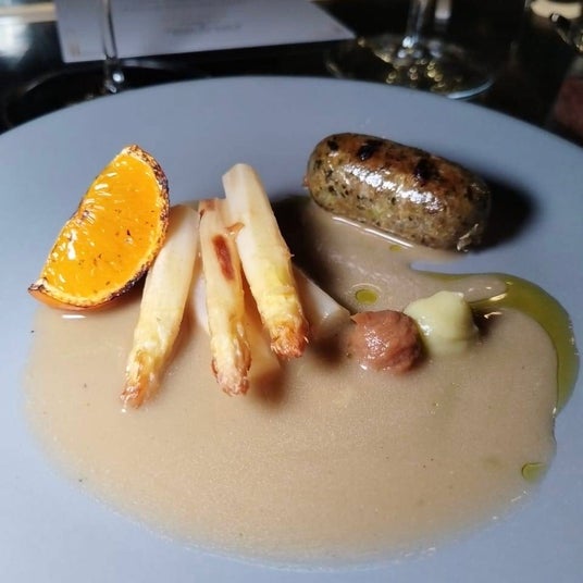 ホワイトアスパラはゆっくりと時間をかけた火入れで、甘さを極限まで引き出す。ソースには、アスパラの皮を白身魚の骨と乳で煮出し、青い風味と旨味を余すことなく抽出。さらに、日本のみかんは炙ることで凝縮した果汁を加え、豊かな甘みと酸味でコントラストを演出。特に注目したいのは、肉は使用せずキヌアとセロリの茎を羊の腸に詰めたソーセージ。1日乾燥させることで旨味を凝縮。キヌアの滋味深い味わいと、セロリの風味がふわっと鼻腔を抜ける独創的なアプローチ。