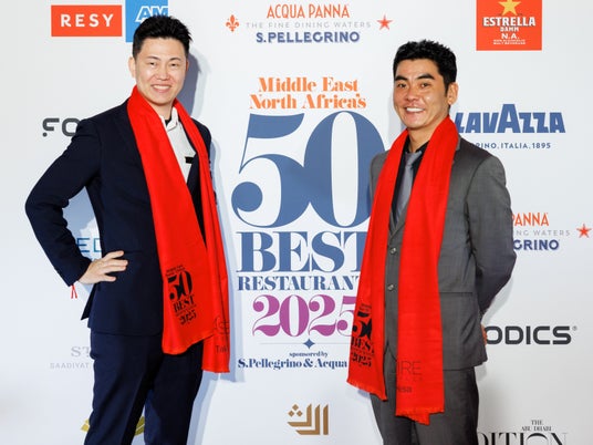 「MENA's 50 Best Restaurants 2025」授賞式にて、受賞シェフに贈られる赤いスカーフを肩にかける、すしシェフ・行方 崇(左)と和牛シェフ・上田 寿夫(右)
