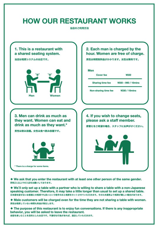 せっかく日本へ旅行に来たので現地の異性と話してみたい。自国にはない相席文化を体験してみたい。日本に住み始めたので日本人の友人が欲しい。そのようなニーズを持つ訪日観光客の方・在日外国人の方こそ是非、ご来店をお待ちしております。
