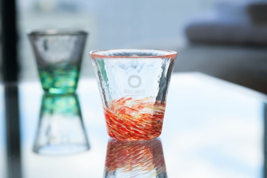 「津軽びいどろの美しい彩り、特別な時間を味わうタンブラー」ReLaboのロゴカラーを基調とした特別な津軽びいどろ。