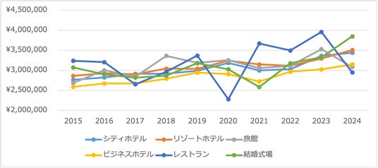 続いて求人施設を業態カテゴリごとに分類し、それぞれの採用時給与の推移を分析しました。集計対象となった求人企業を「シティホテル」「リゾートホテル」「旅館」「ビジネスホテル」「レストラン」「結婚式場」の6カテゴリに区分しています。各カテゴリの給与傾向には次のような特徴が見られました。