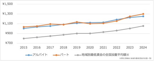 アルバイト・パートの時給推移: 2015~2019年は緩やかな上昇傾向で、年平均成長率約2.0%と最低賃金の上昇率(平均約2.8%)をやや下回る水準でした。しかし2020~2022年はコロナ禍の影響で外出自粛や営業休止が相次ぎ、時給は成長率0%~マイナスと停滞・減少しました。その後、2023年5月の感染症法上の分類見直しやインバウンド再開による宿泊需要急増に伴い、2023年には採用時給が急上昇します。特に需要回復期の人手不足を補うため採用活動が活発化し、一時は前年比+13.8%超という大幅な時給アップが記録されました。2024年もこの高水準を維持して推移しており、同年秋に実施された最低賃金制度の全国平均賃金推移は過去3年間(961円→1,004円→1,055円)の大幅引き上げが下支えとなって、ホテル業界の時給相場はコロナ前より明らかに底上げされています。