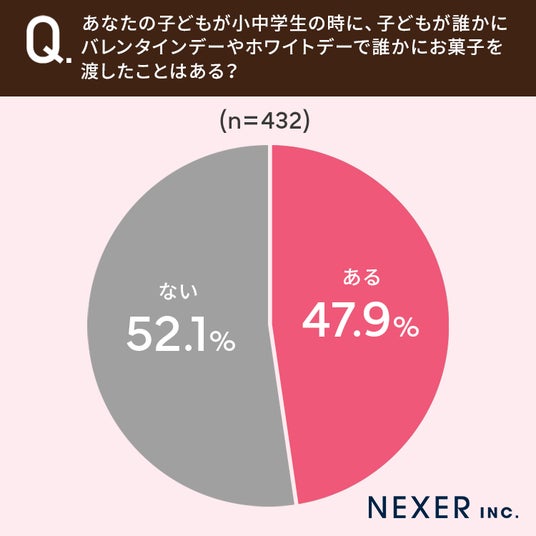 47.9%と約半数の方が、子どもが誰かにバレンタインデーやホワイトデーで誰かにお菓子を渡したことが「ある」と回答しています。